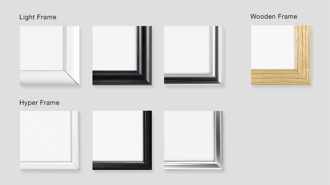 ポスターのみの基本仕様のほか、オプションとしてデザインや素材の異なる3種類のフレームをご用意しました。インテリアに合わせてコーディネートいただけます。