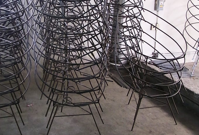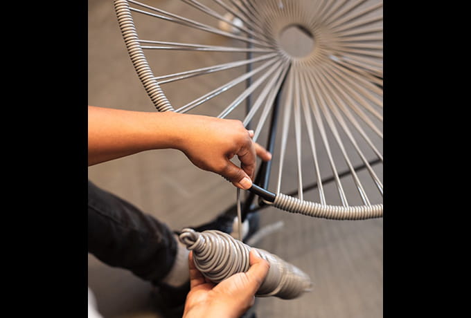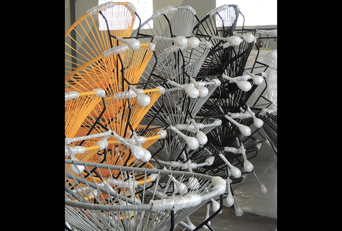 現地では、PVCコードを製造するところから、フレームの金属加工、コード編みまで製造工程のすべてを一貫して同じ工場で製作しています。