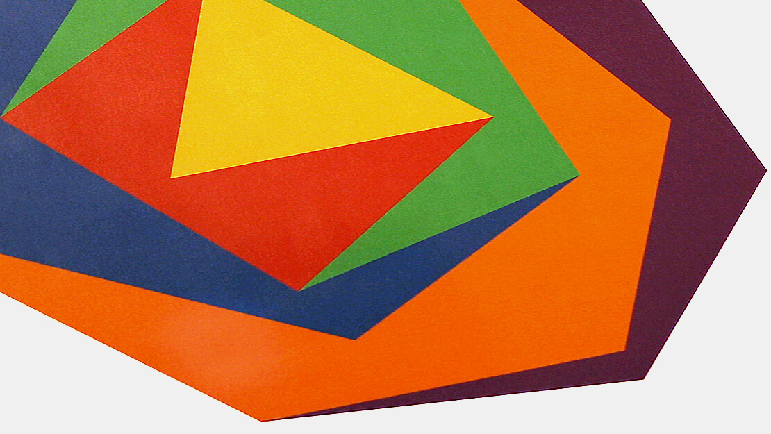 テーマ(原図)の螺旋形を各多角形毎に閉じて面とする。正三角形には黄、正方形には赤というように、各多角形毎に黄・赤・緑・青・橙・紫の計6色を与え、各図形毎に固有の色とする。以降の彩色のルールとなる。